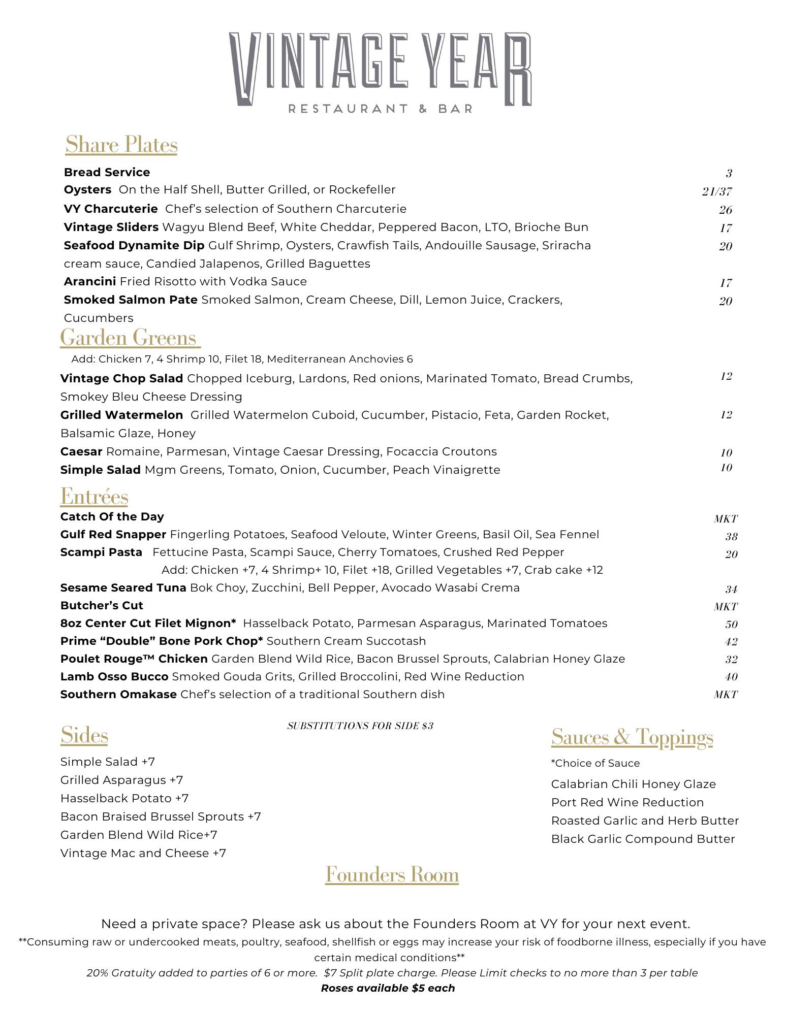 Vintage Year is dedicated to providing guests with the finest hand-cut meats, the freshest seafood, outstanding wine and spirits along with excellent customer service.